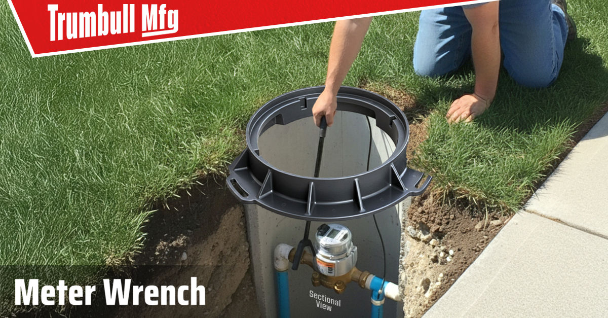 The Trumbull Meter Wrench is used to install and remove meter couplings in buried meter boxes and meter pits. The 16″ handle allows worker easy access into these confined areas. Works with 1/2″ through 1-1/2″ meter couplings. Special features include resilient grip on handle and replaceable jaws.